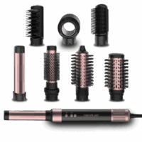 - Consigue una mayor variedad de peinados con sus diferentes cabezales: secador, cepillos de 33 mm, 40 mm y 70 mm, 2 peines, 2 cilindros rizadores (derecha e izquierda). Moldeador multifunción con 8 cabezales.