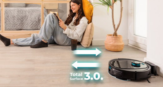 - La limpieza nunca se queda a medias. Con Total Surface 3.0. la limpieza nunca se queda a medias. Si el robot se queda sin batería, vuelve a la base de carga y retoma la limpieza para terminar con la limpieza programada una vez cargada la batería.