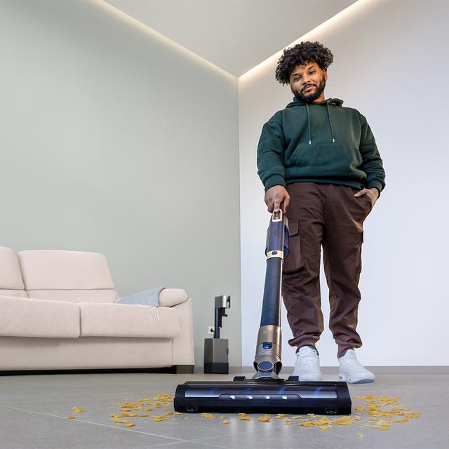 Aspirador vertical inalámbrico, sin bolsa con base de autovaciado de 210 W y 20 kPa de presión de succión con autonomía de hasta 40 minutos.